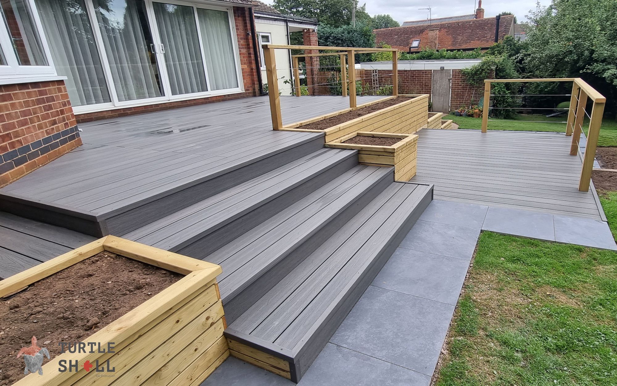Для отделки боковых элементов террасы также использовалась универсальная доска ДПК Turtle Shell, которая обеспечивает единый стиль и гармоничный вид всей конструкции. Кроме того, для создания законченного внешнего вида был использован уголок ДПК Turtle Shell Canadian Maple Co-Extrusion.